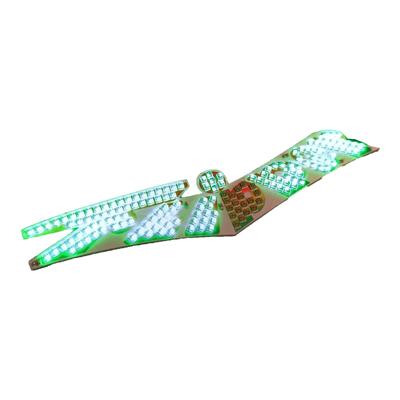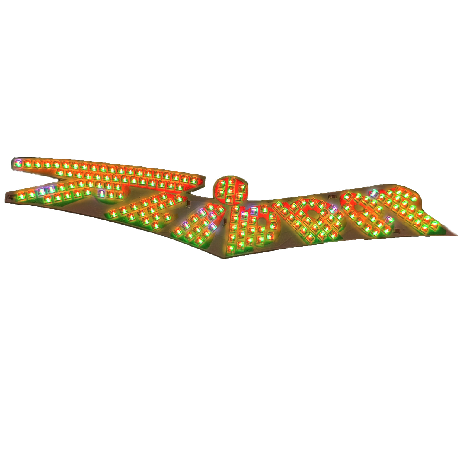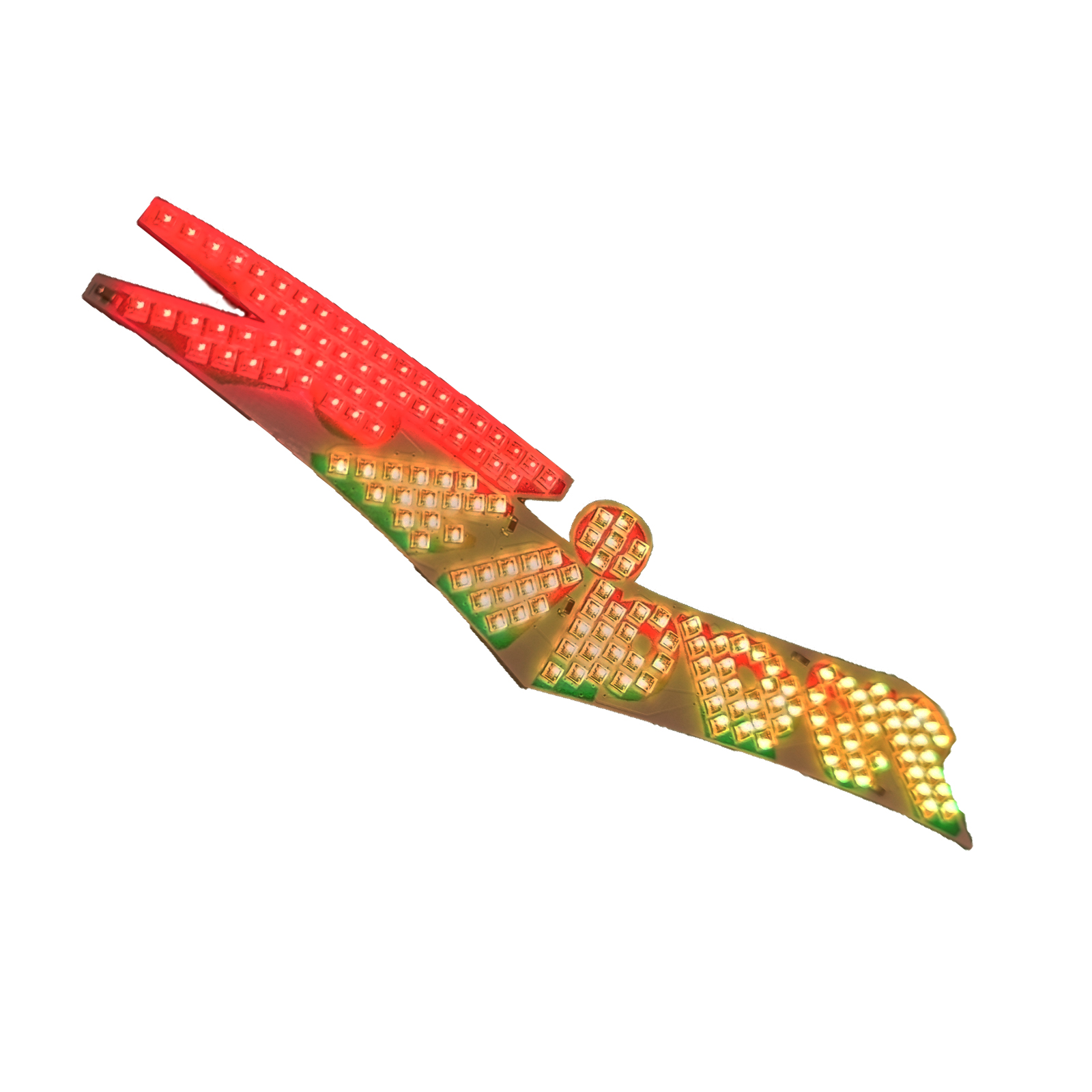 Bestückt mit insgesamt 258 Pixel LEDs der Größe 1,5 x 1,5 mm, sowie 21 Pixel LEDs der Größe 1 x 1 mm am Stern.