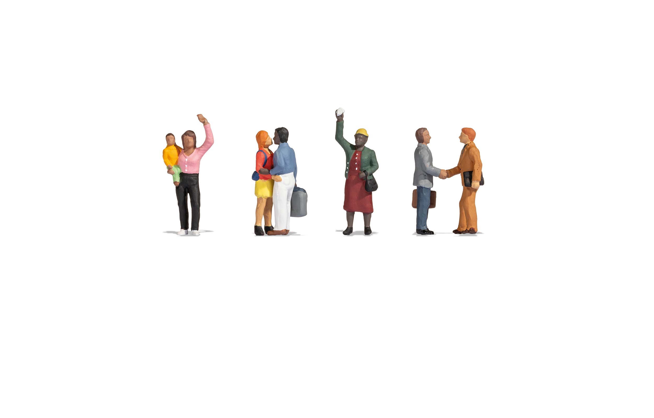 Außerdem ist eine Mutter in einer rosa Jacke und einer schwarzen Hose zu sehen, die ihr Kind auf dem Arm hält und zum Abschied winkt.