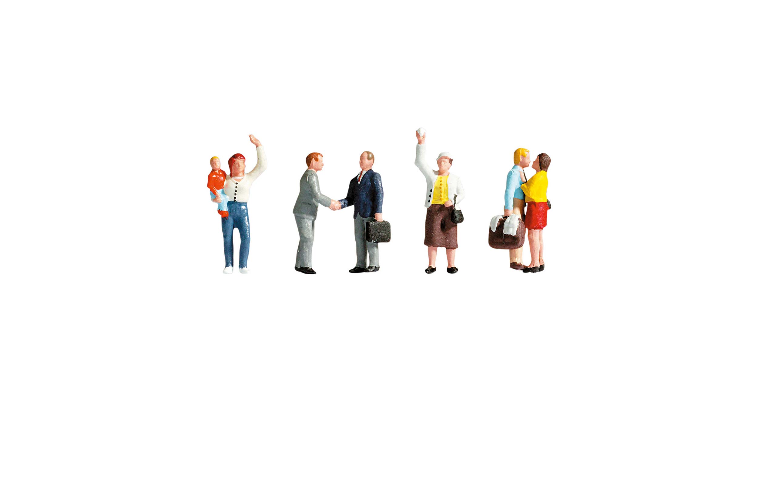 Alle Figuren stellen eine Abschiedsszene dar: Eine Mutter mit Baby auf dem Arm winkt dem Zug nach.