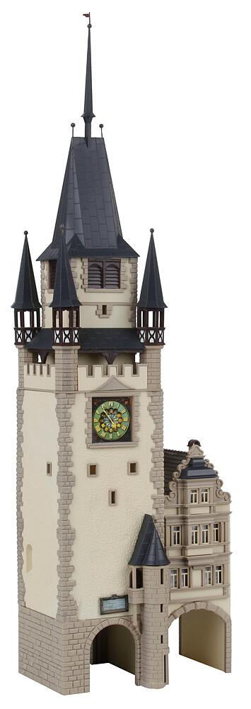 Repräsentativ! Ansehnliches Stadttor mit Turmuhr und vier überdachten Ecktürmchen,
