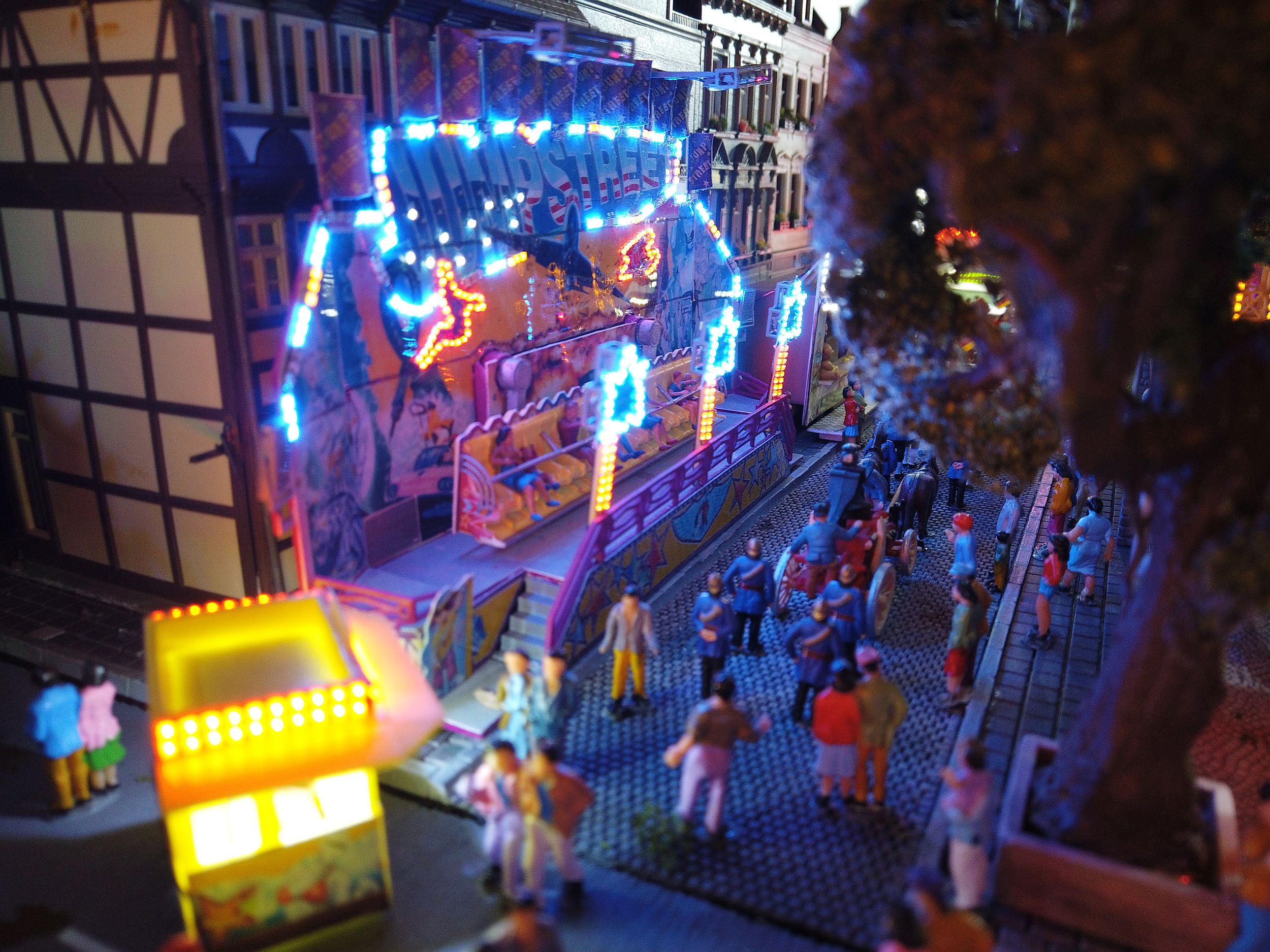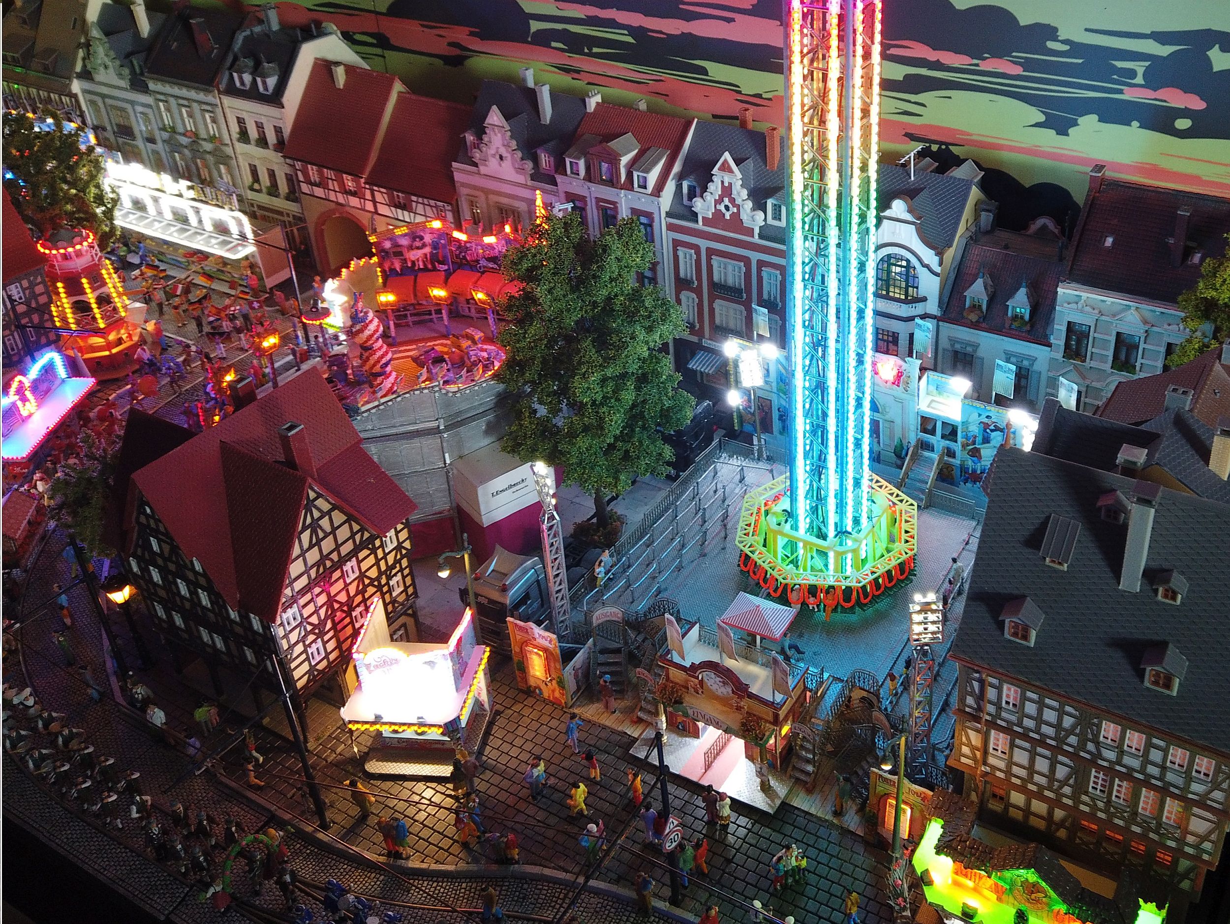 Die Einbindung von Kirmesmodellen in eine historische Altstadtszenerie verleiht dem Gesamtbild eine besondere Lebendigkeit und Atmosphäre.